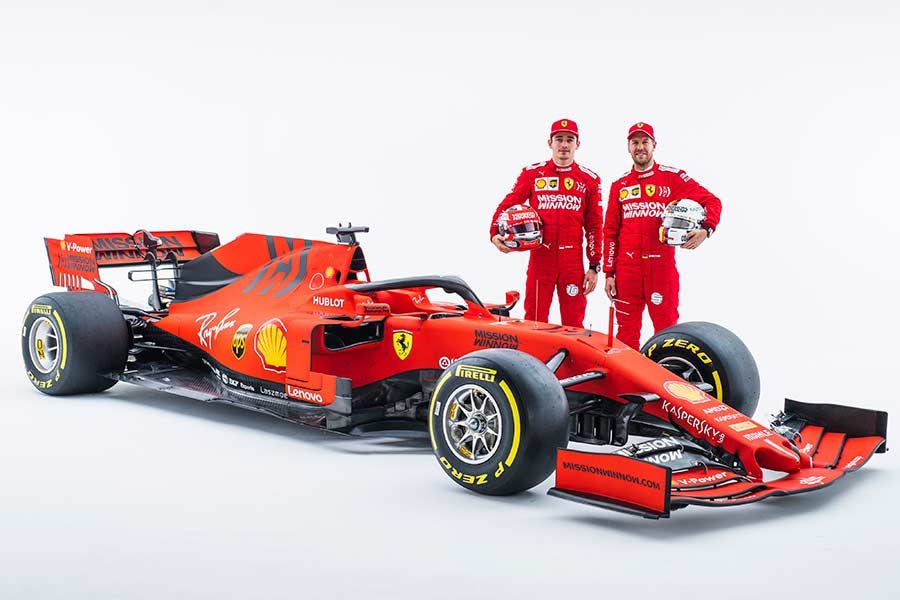 Nas últimas duas temporadas, a Ferrari foi a única a incomodar hegemônica Mercedes. Nesse ano, a equipe italiana vem com importantes mudanças no corpo técnico: sai o chefão Maurizio Arrivabene, ex diretor de marketing de um patrocinador da equipe, e assume Mattia Binotto, funcionário de carreira no time desde os anos 1990 e responsável pela parte técnica até o ano passado. A mudança foi bem vista pela exigente imprensa italiana. O carro, batizado de SF90 em homenagem aos 90 da equipe, vem em um vermelho mais escuro e fosco, com mais detalhes pretos. Com ele, o time espera quebrar a sequência da Mercedes e voltar aos títulos, em falta desde 2008. O alemão Sebastian Vettel continua ao volante de um dos carros, enquanto o outro passa às mãos do jovem monegasco Charles Leclerc, vindo da Sauber.