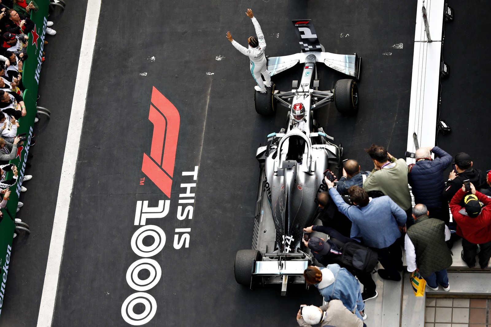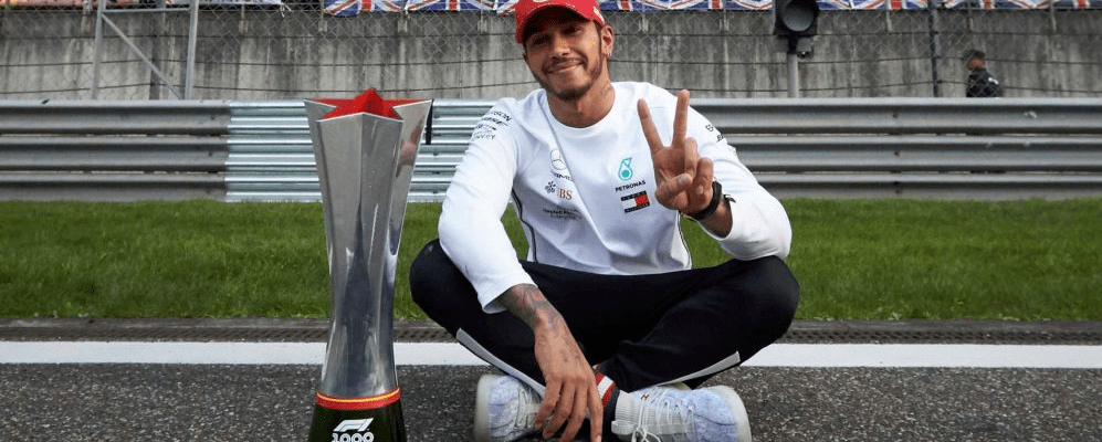 Hamilton celebra a vitória no milésimo GP da Fórmula 1 (Imagem: FIA)