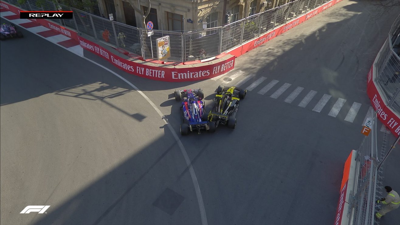 No pelotão intermediário, erro crasso de Ricciardo: ao tentar ultrapassar a Toro Rosso de Daniil Kvyat, o australiano exagerou, travou os pneus, passou reto e obrigou o russo a também sair da pista para evitar o contato. Não satisfeito, Ricciardo deu ré em direção a pista e acertou em cheio o carro de Kvyat, causando o abandono de ambos. Papelão nada digno das belas corridas que fez nos anos de Red Bull.