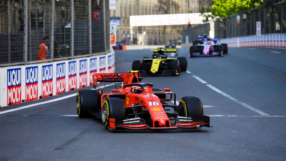 Leclerc, como já citado, com pneus médios, começou a voar. Foi galgando posições até chegar próximo ao companheiro Vettel, então terceiro, na décima segunda volta. Em ritmo muito superior aos demais, assumiu a liderança com alguma vantagem após a parada das Mercedes. A Ferrari optou por manter o monegasco na pista para tentar colocar os médios apenas no final, em estratégia invertida em relação aos demais ponteiros. Mas os pneus médios se mostraram realmente melhores com Verstappen e as Mercedes fazendo seguidas voltas mais rápidas. Já com pneus desgastados, Leclerc viu sua vantagem despencar e as Mercedes e a Vettel encostarem. Bottas, Hamilton e Vettel vinham a apenas 3,5 segundos um do outro. Um a um, todos deixaram Leclerc para trás, até que este parasse na volta 32. A estratégia não deu certo, e o jovem voltou apenas na sexta posição, atrás até de Gasly, que largara dos boxes, e a mais quase 30 segundos de Verstappen.